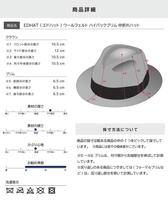 商品について 老舗国内帽子ブランドEDHAT(エドハット)のウールフェルト素材を使用した中折れハット。